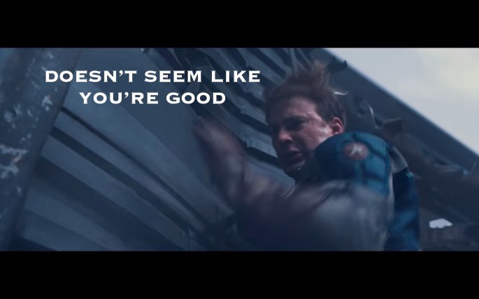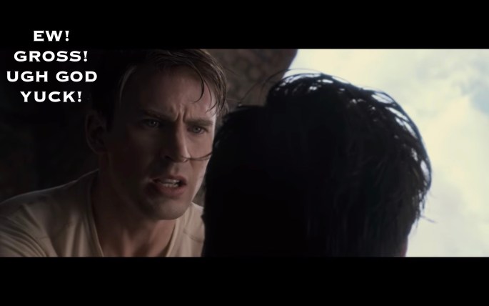 You know when people are dehydrated and that weird gross white goop forms at their lips? That’s what this scene made me think of, and I legit gagged. Anyway, this guy was all, “Hail Hydra! See you never!” and Steve was like, “????” but that didn’t really matter short-term, because the last of the super-soldier serum was smashed, and Steve was out of a job.