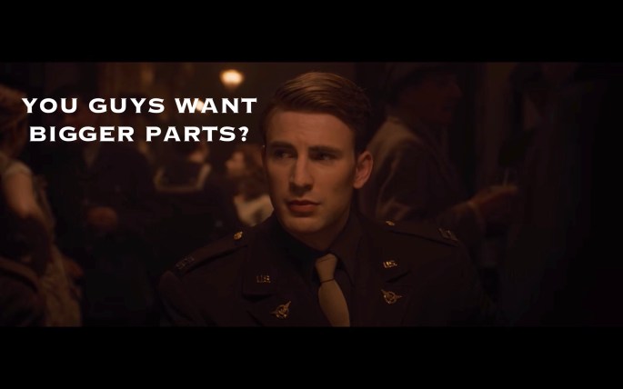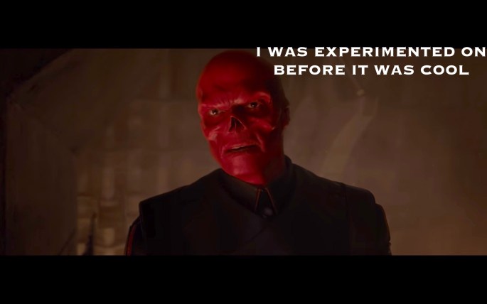 Success! It sounded like it hurt a whole lot, but Steve soldiered through (yes, that was a pun, love me for me), and was Captain-America-ified. Then a hydra agent stole the serum and ran off, killing Doctor Stanley Tucci, which means he and Steve can never have that drink together, and now I’m upset. Oh, and the serum can’t be replicated, that part is a bummer too, I guess.