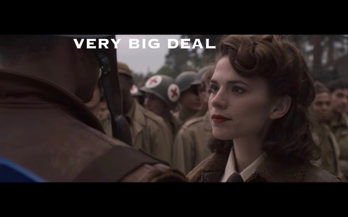 Peggy gave him a pep talk about having more options than lab rat vs. dancing monkey, then she happened to mention who he was there ‘entertaining’, and wouldn’t you know it – it was Bucky’s unit! Bucky himself was missing behind enemy lines along with a whole whack of allied soldiers. Cap was all, “let me save them!” and Colonel Phillips was all, “nuh uh!”, so Steve had to go behind his back like a cheeky, heroic little gremlin.