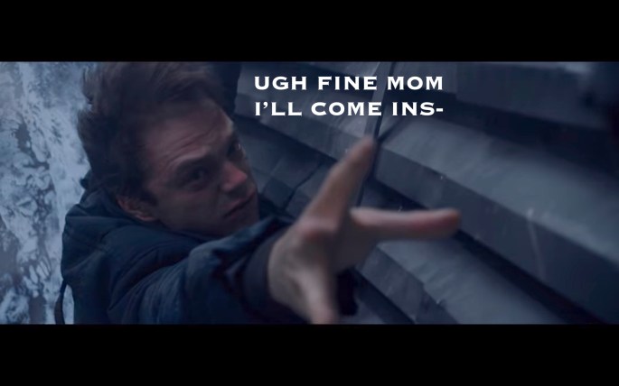 Steve was getting Bucky out, but then the fire raged on and the beam broke, and Steve was all, “get out of here!” and Bucky was all, “Not without you!” and then Steve yelled, “I love you and I respect your decisions!” and Bucky yelled back, “I have always admired you and I strive to be more like you,” and Steve was like, “k back up, here I come,” and Bucky was like, “I support you in whatever endeavor you may embark on!” (I may be paraphrasing) Cap jumped and the screen filled with flame and we didn’t know whether or not he survived (LOL).