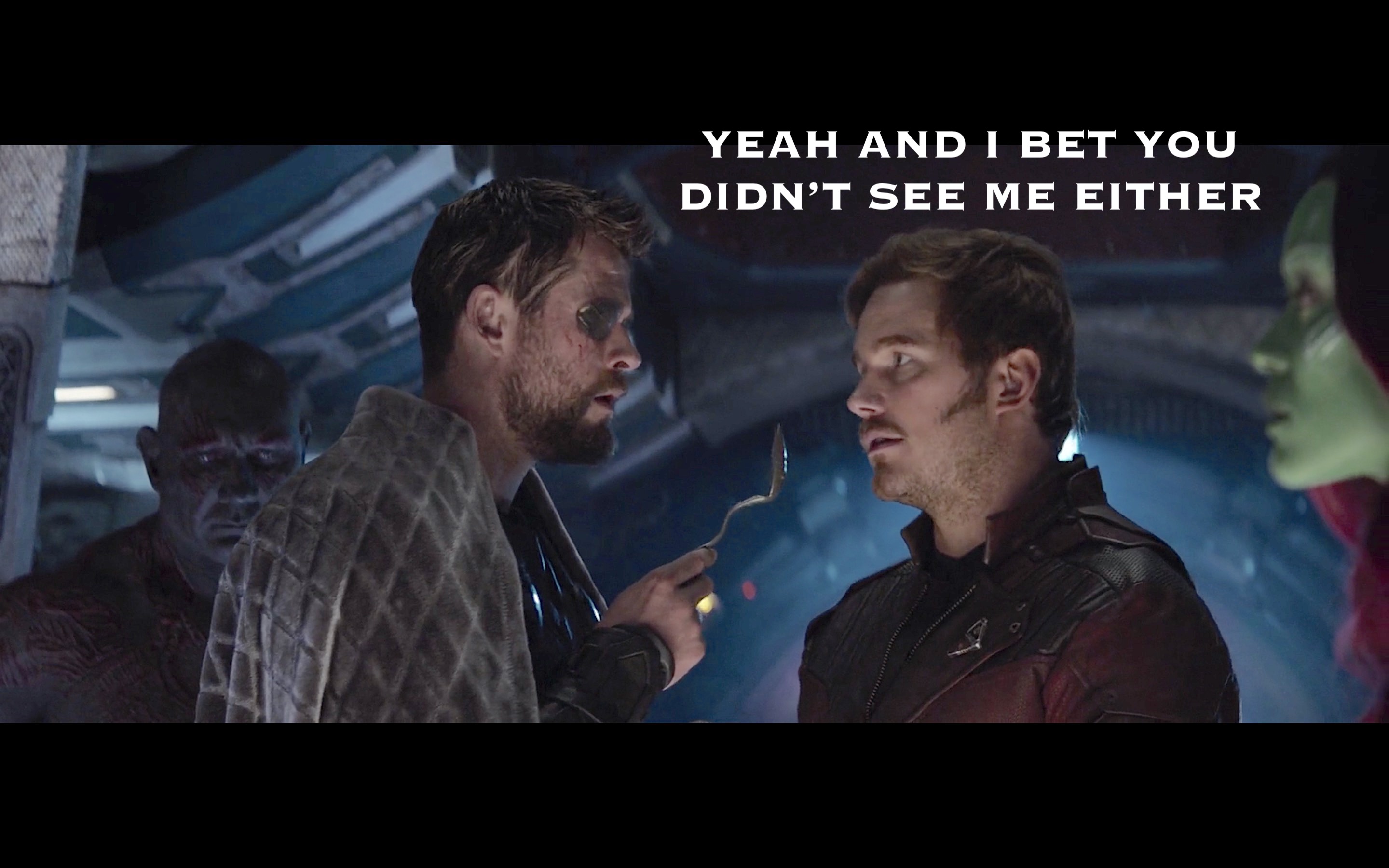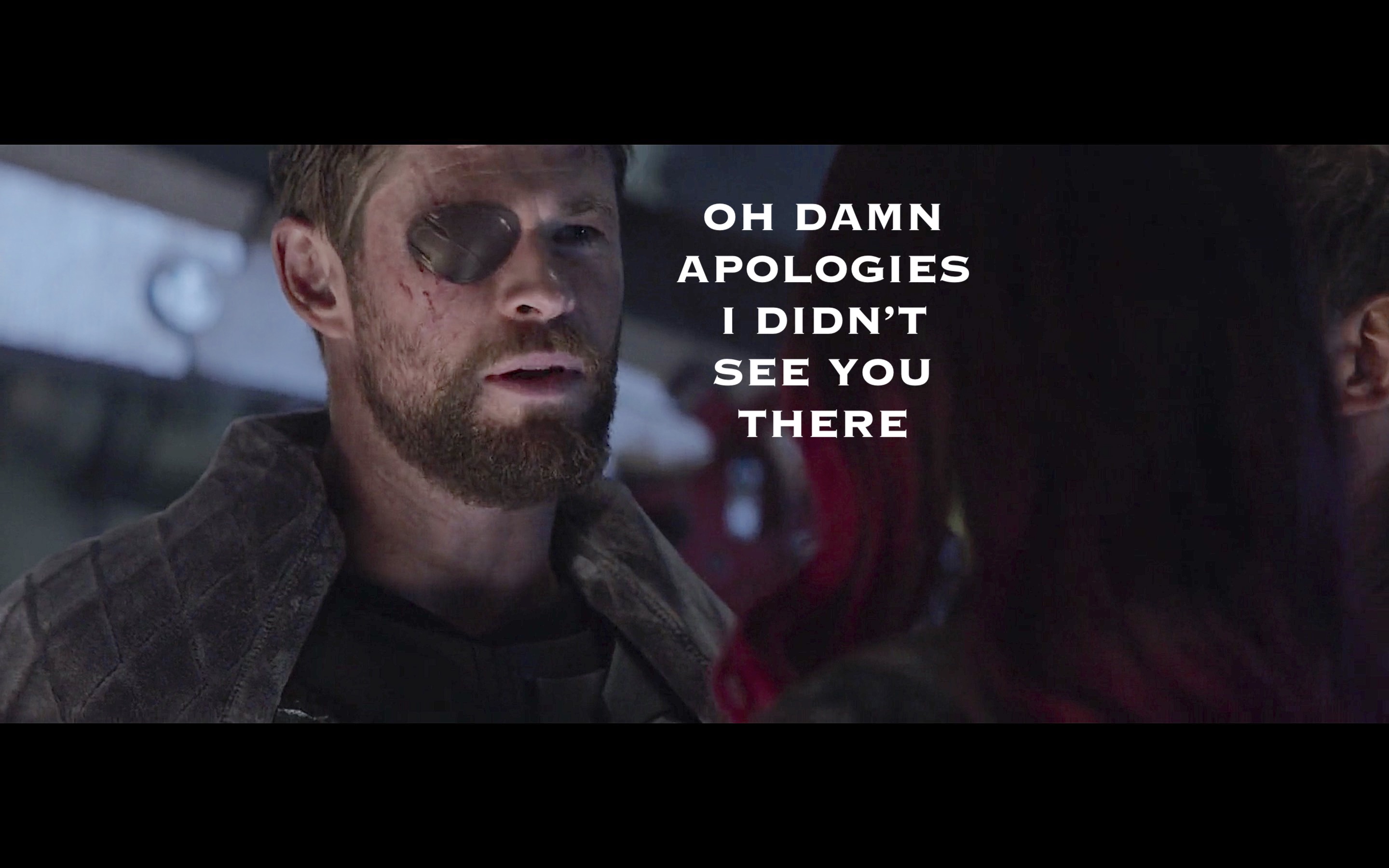 Thor finally, FINALLY showed some emotion about all the shit that happened during Ragnarok and the opening scene of this movie. I loved it, obviously, but I just couldn’t get past one line… “you got a best friend?” – “Stabbed through the heart.” Is he… is he talking about Heimdall?? I mean, sure, they were buds, but is the MCU seriously so hell-bent on wiping the Warriors Three from our memories?? And what about SIf?? I was so indignant on their behalf, I think I actually said, “wait what?” out loud in the theatre.