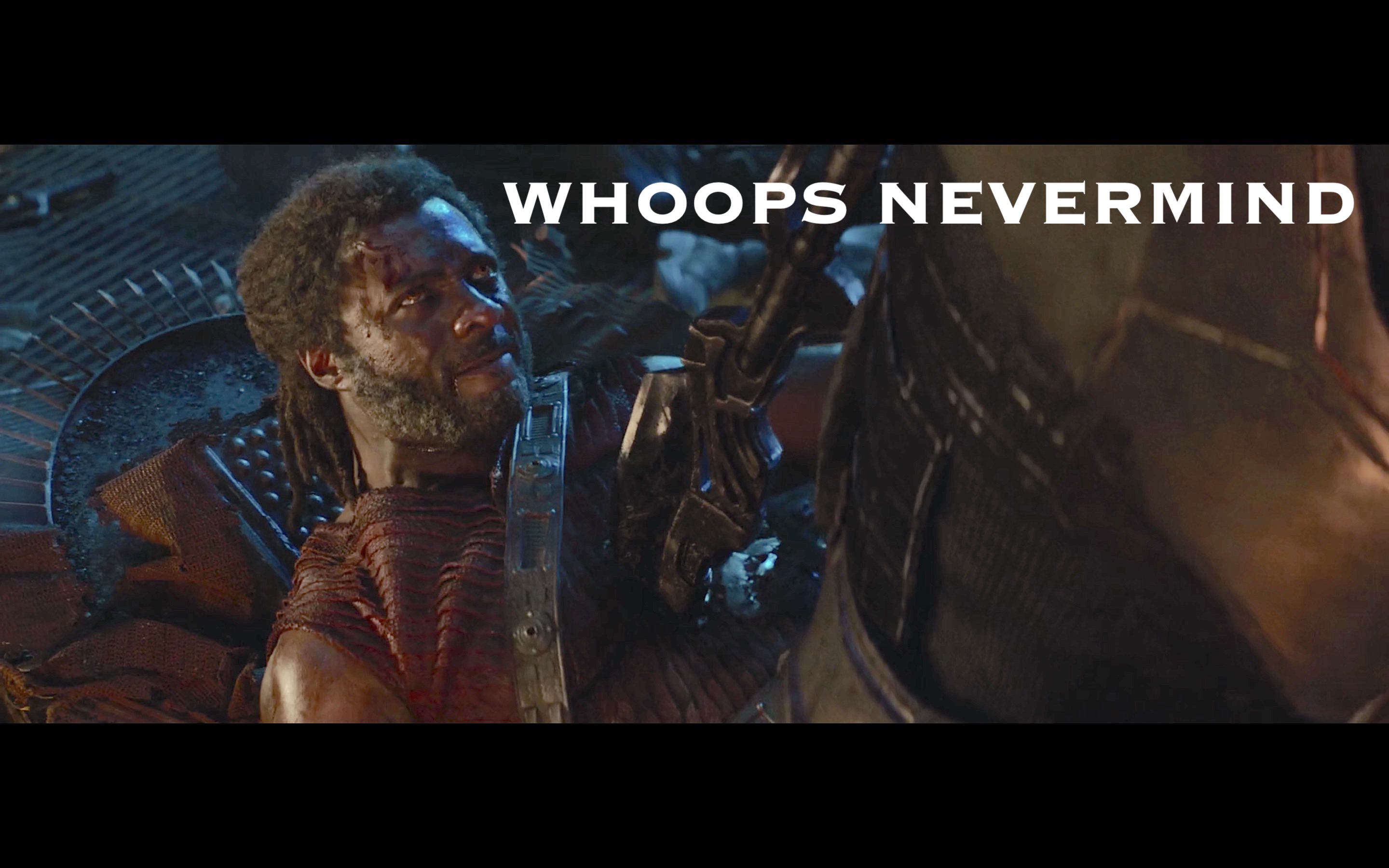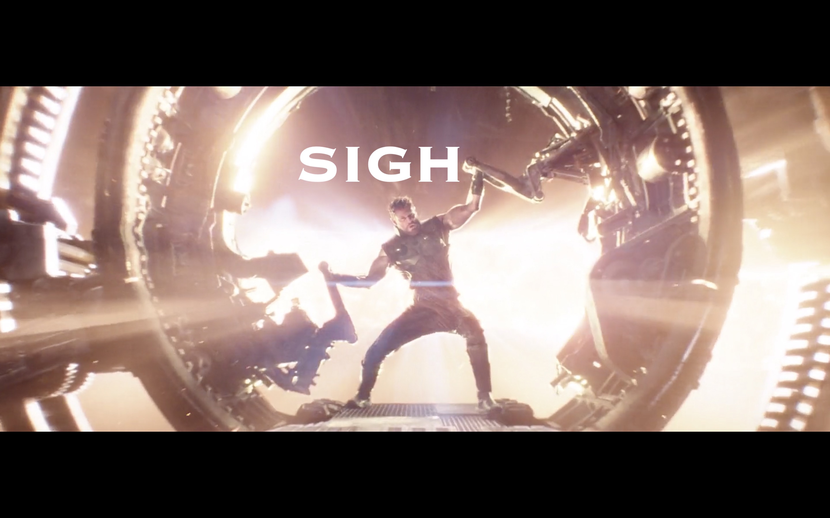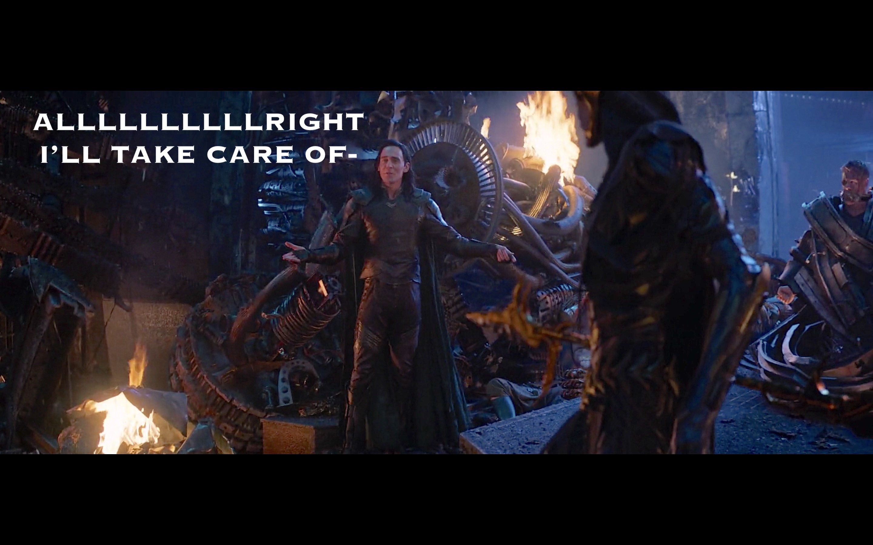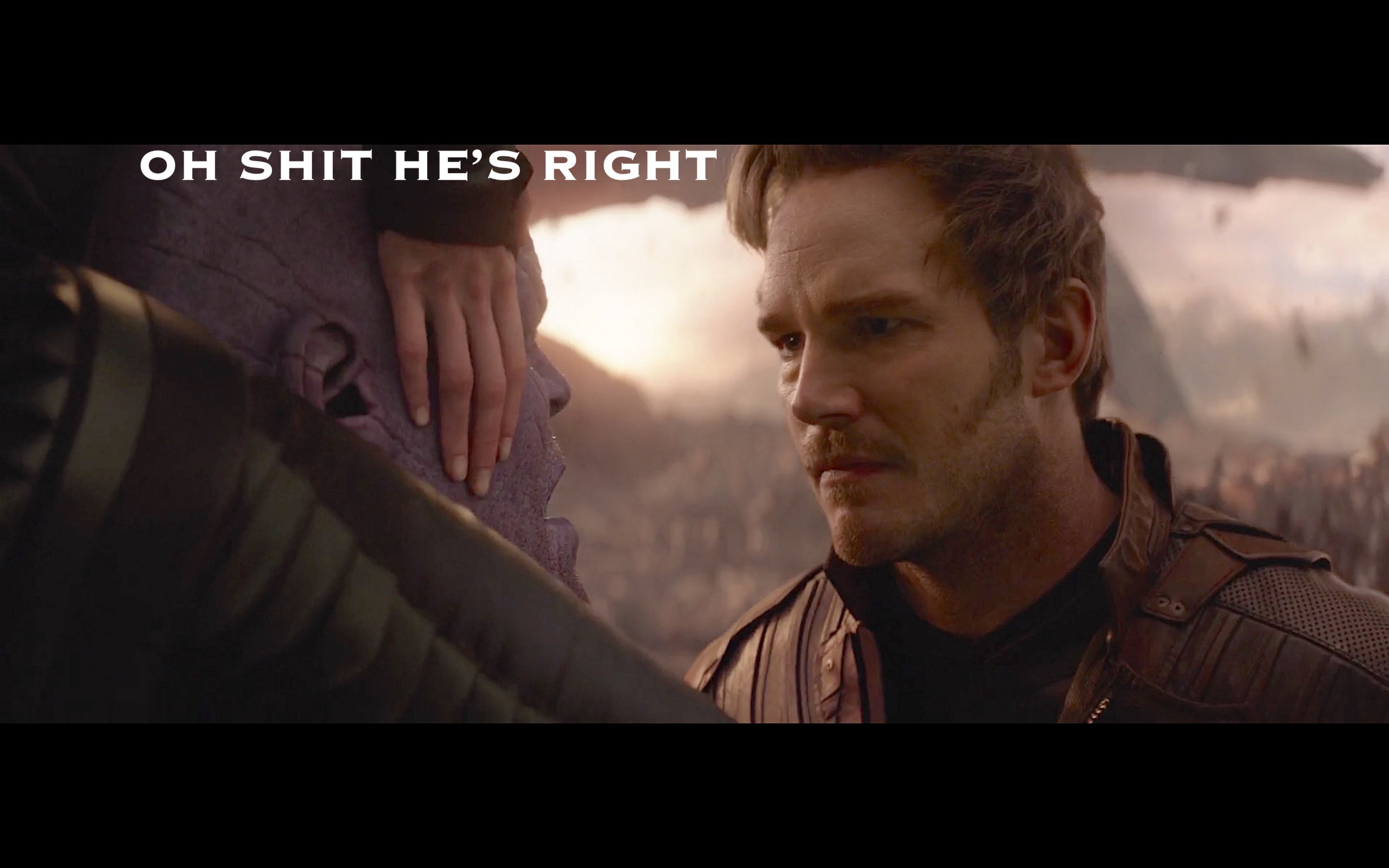 Oh damn. Never effing mind, you guys, that was AWFUL. Ugh, God, why would you… why would you OPEN a movie with…. *sobs* okay, okay, okay, let’s pull ourselves together. So, um, *clears throat*, Loki is dead, Heimdall is dead, Valkyrie and Korg are missing I guess, Thor is essentially defeated, and Thanos has both the Power and Space stones. This movie is NO JOKE.