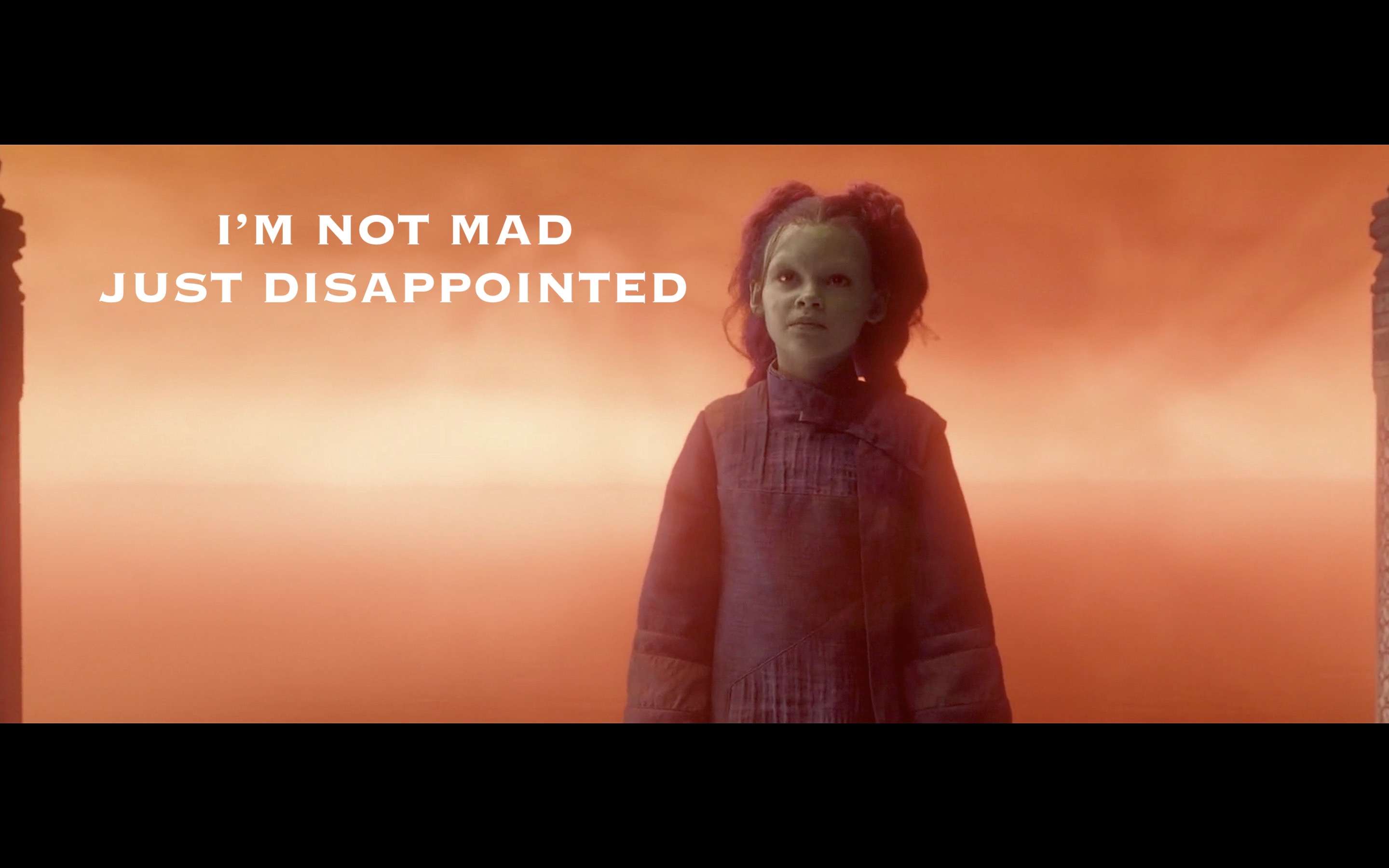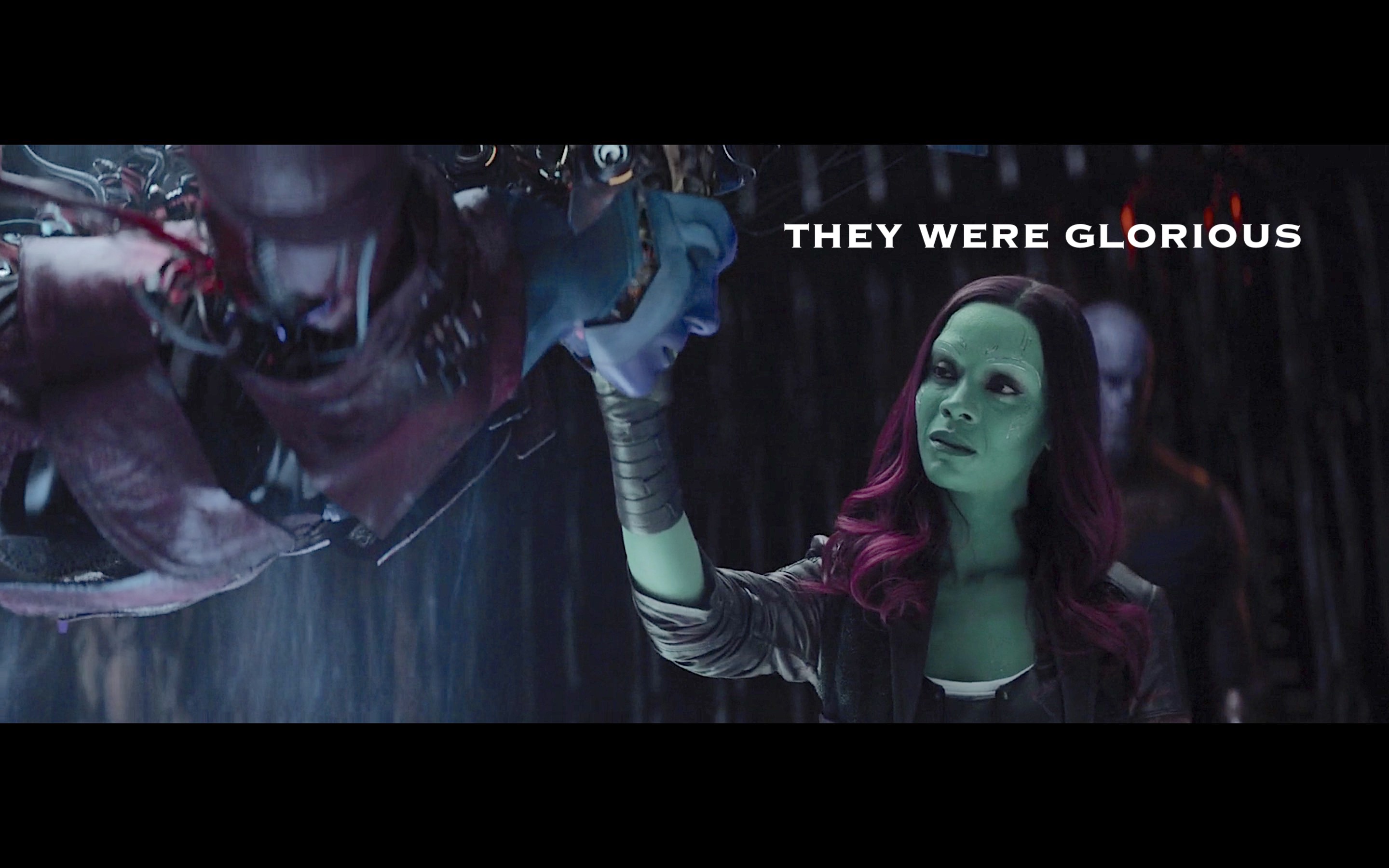 We got a fun Gamora flashback from when half her planet (including her mother) was massacred, and the guy who did it adopted her. Awwwwwwwwwwwww. Speaking of SUPER SWEET moments, Gamora asked her official BF to straight-up murder her if she happens to get captured by her adopto-dad. So… just a great, happy sequence of scenes.