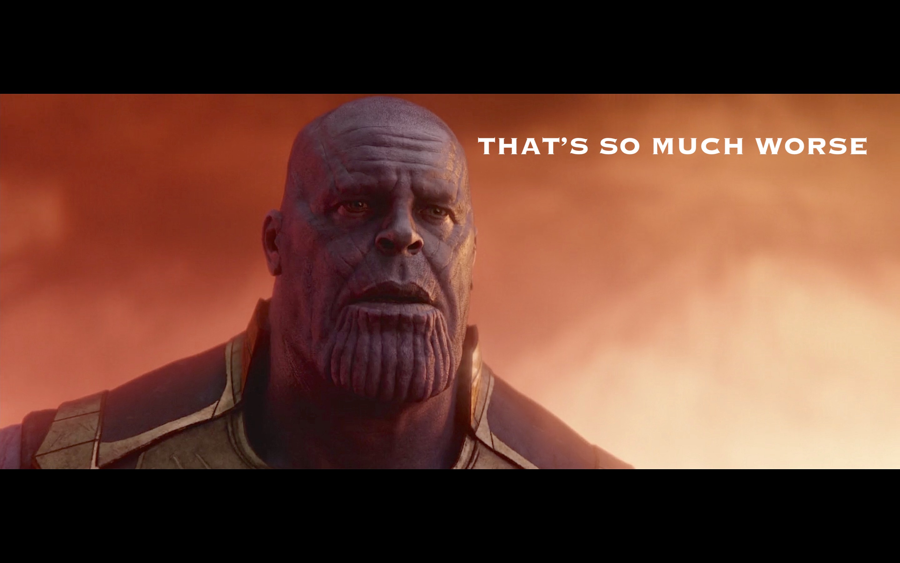 - I read that Thanos also snapped away half the plant life and animals, which is… um, food, right? Did Thanos snap away half the world’s resources as well as the people? So the same problems still remain? Am I wrong on this? Tell me I’m wrong.