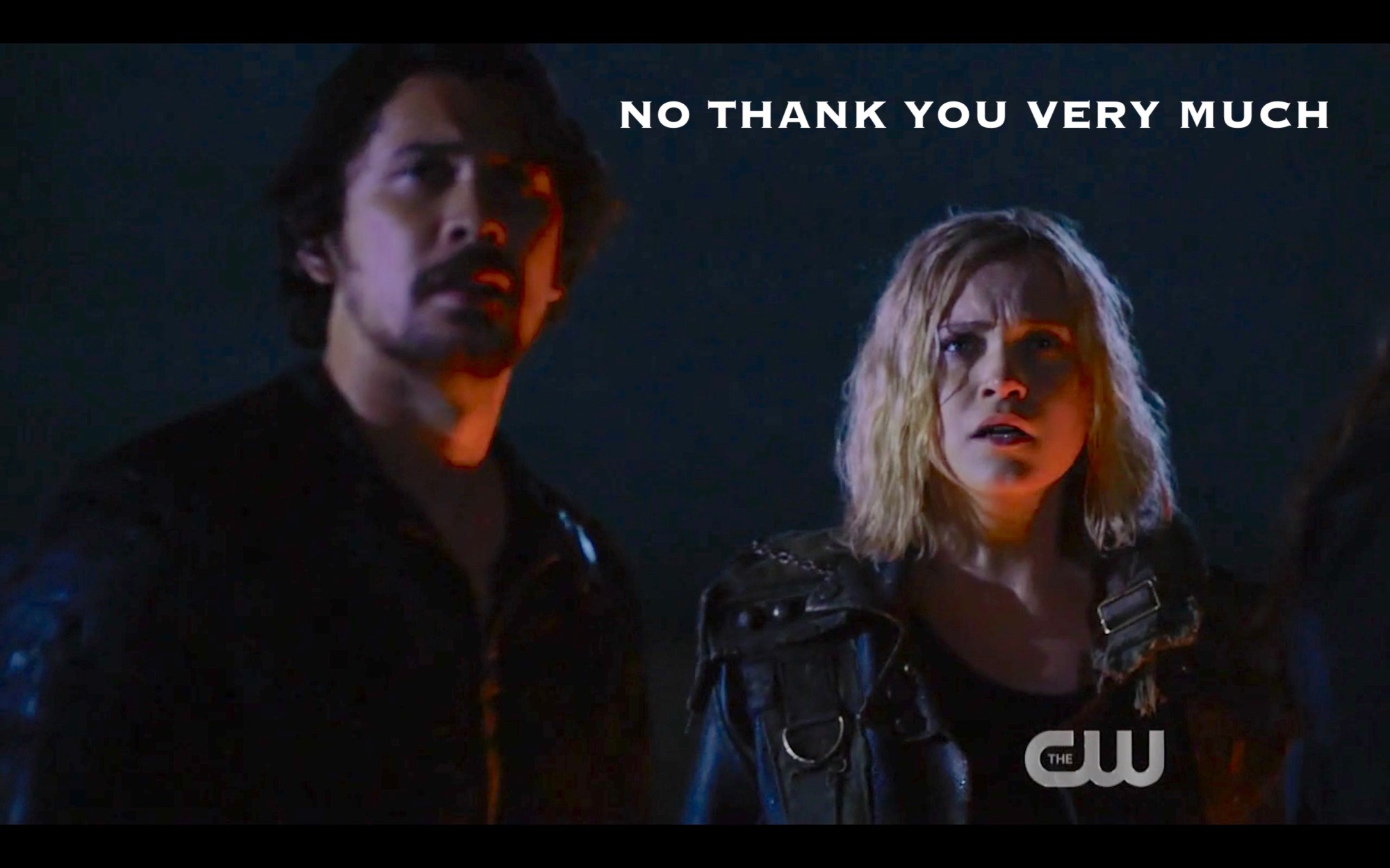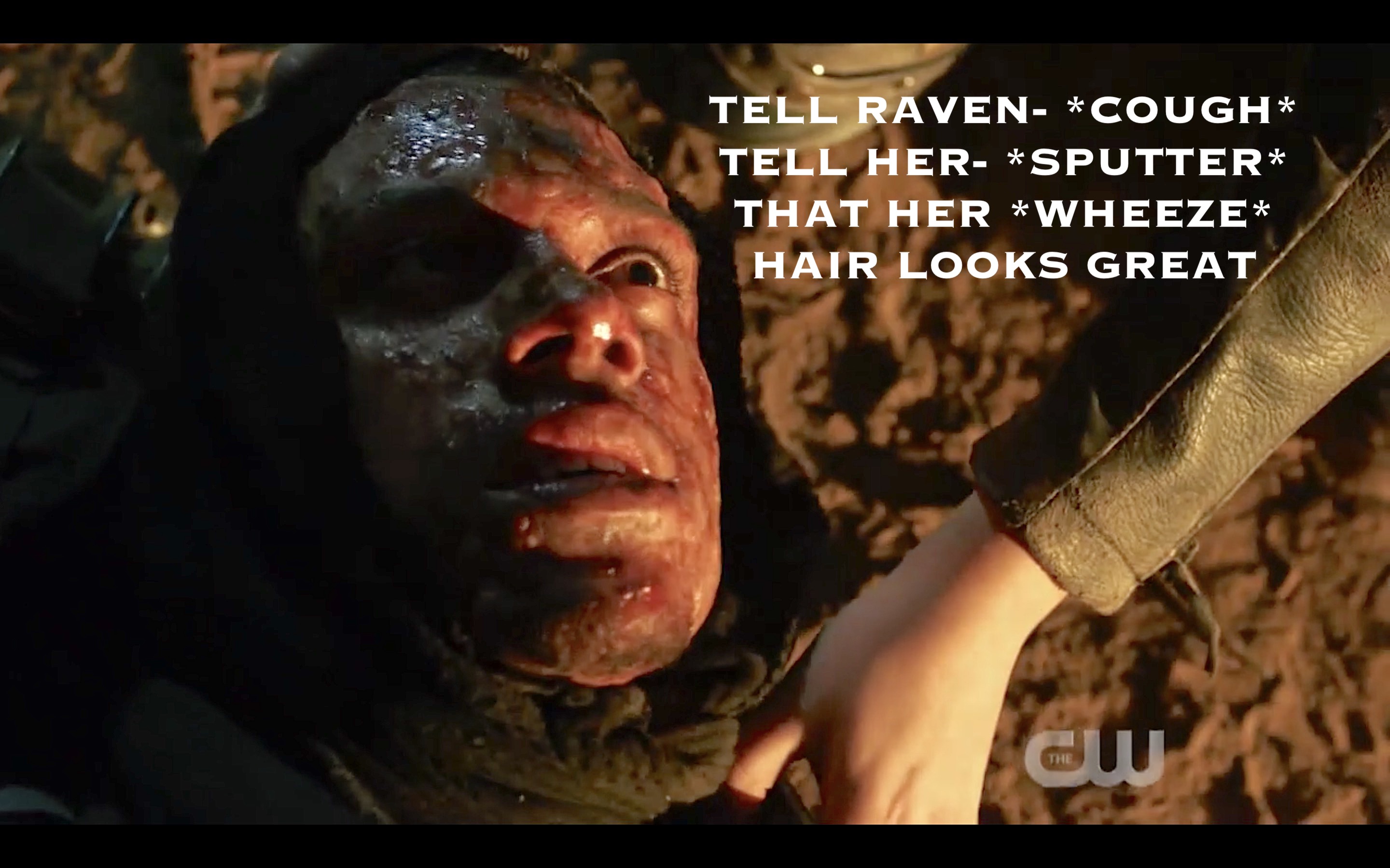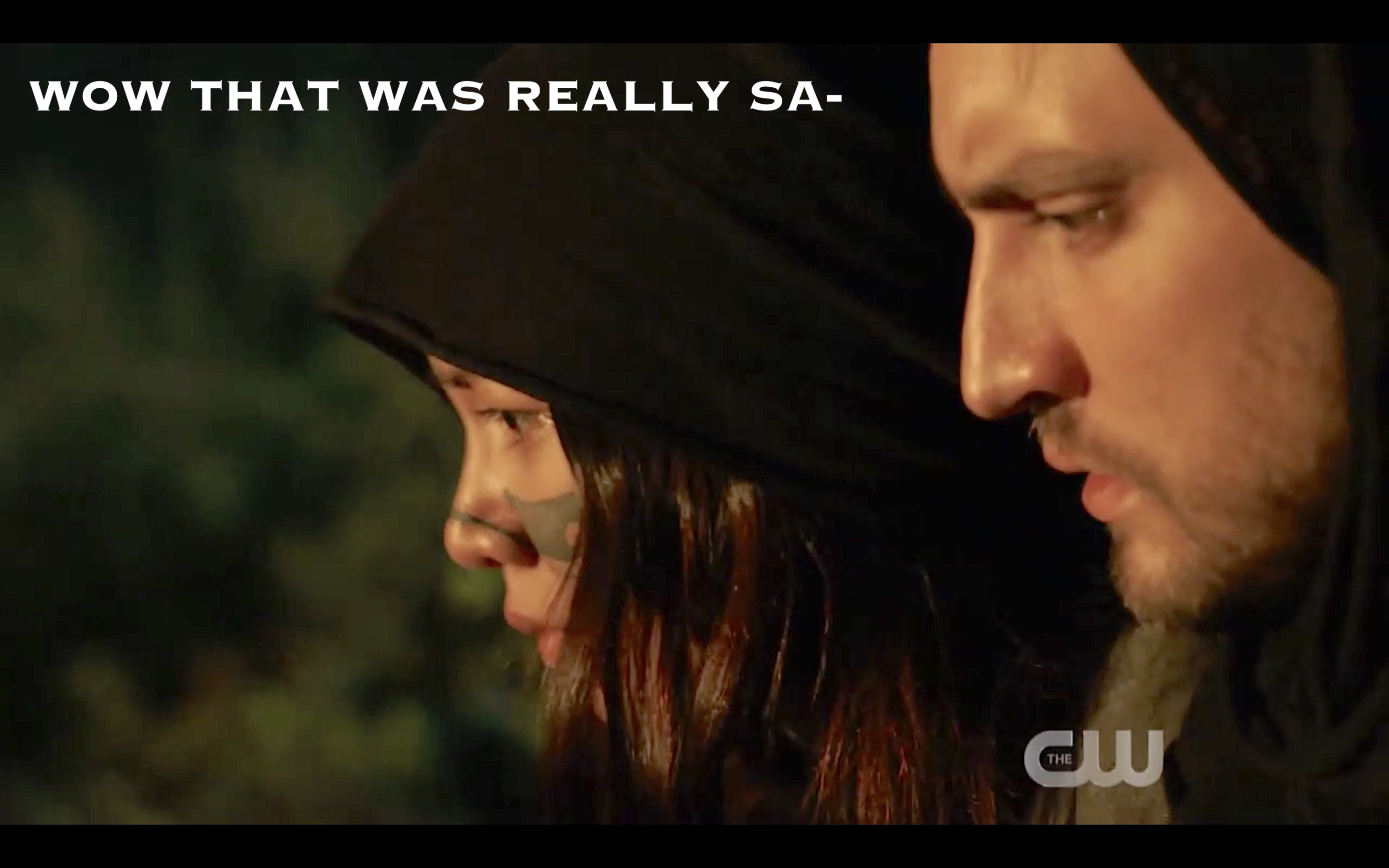 Whoopsie, scratch that. Octavia came in all, “remember how I’m a monster because you guys are the worst?” and then Kane’s emotions made his body self-destruct. This was rough because they were both kinda right? Most of what Octavia did was to keep people alive. Except burning down the farm… that was a dick move. So Kane had a point, but at the same time, he betrayed his people and got a lot of them killed. So…? I don’t know. All three of them are simultaneously the best and the worst, and it confuses my heart, and yet I still love them.