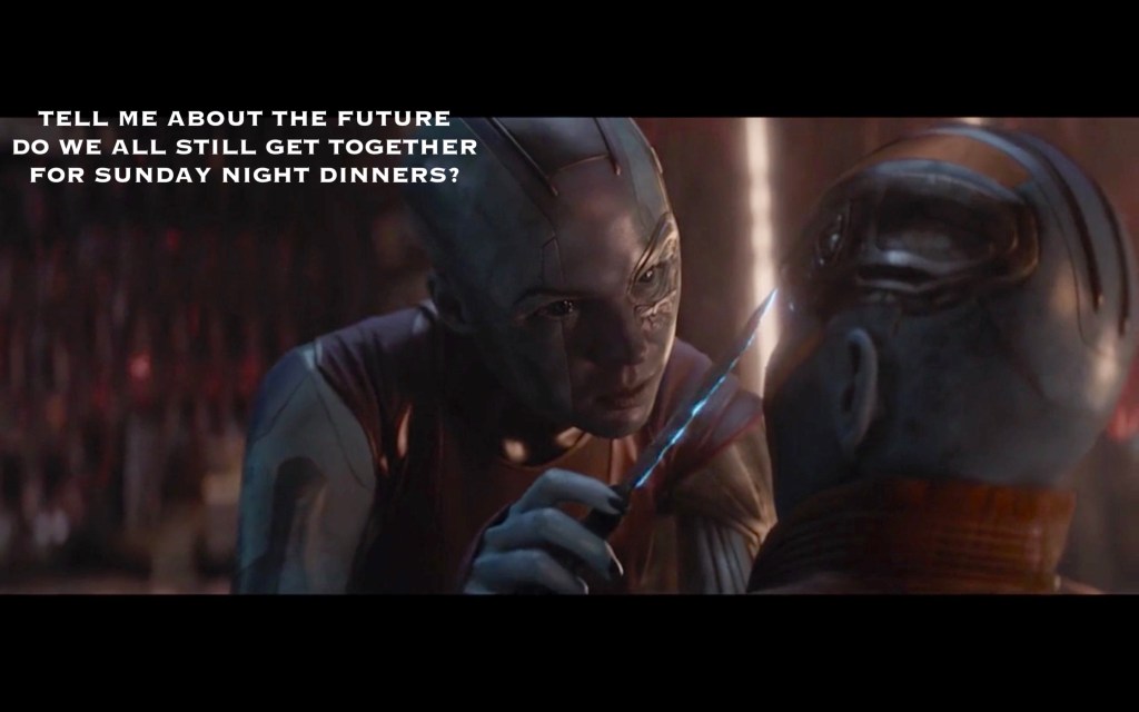 At this point Clint had the gauntlet, and Past-Nebula was all, “hello Earth friend of mine, nice gauntlet, may I have a looksee?” and he was like, “why are you being weird?” and then he figured out she’s NOT his recently acquired alien-pal and tried to get on outta there. It wasn’t looking great for our boy, but then a freshly traitorous Gamora showed up with Present-Nebula, who quite literally killed the demons of her past.
