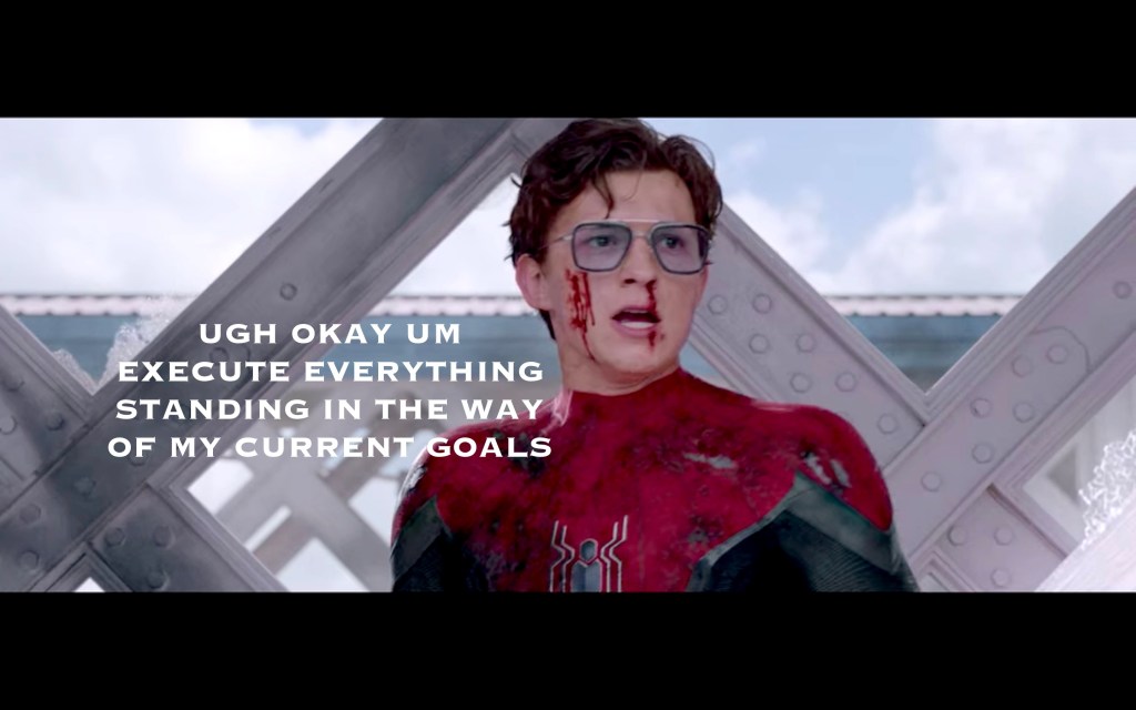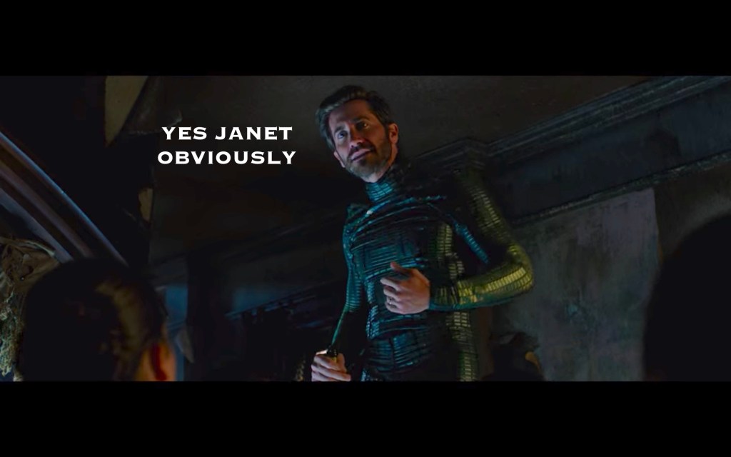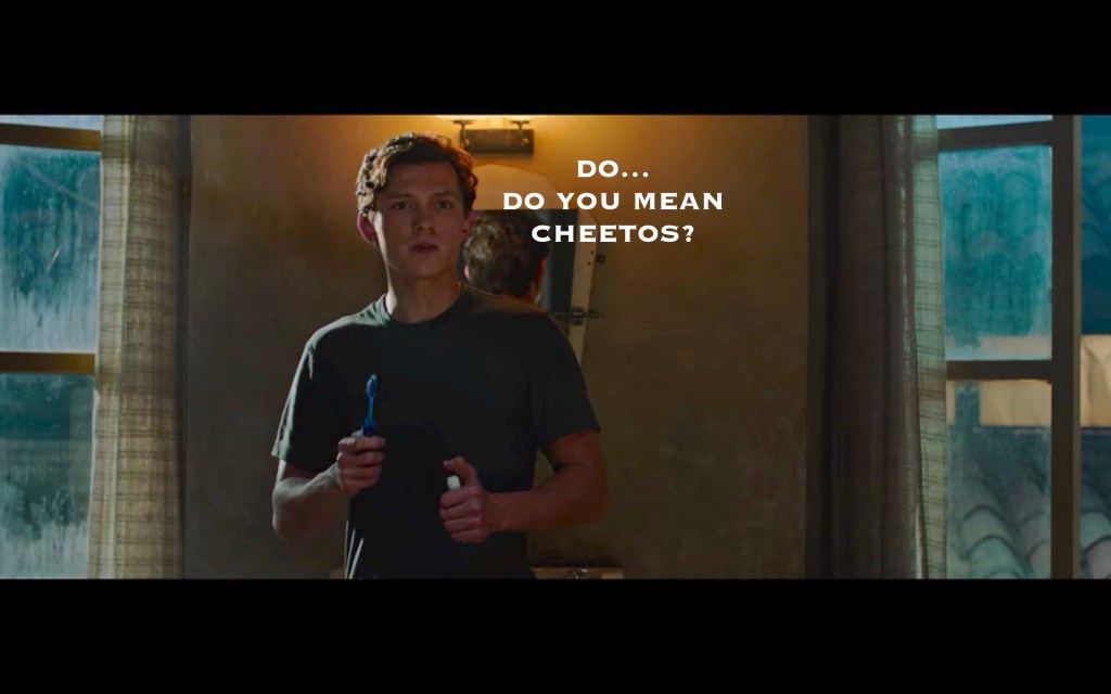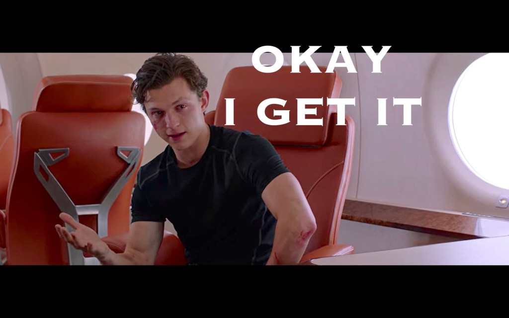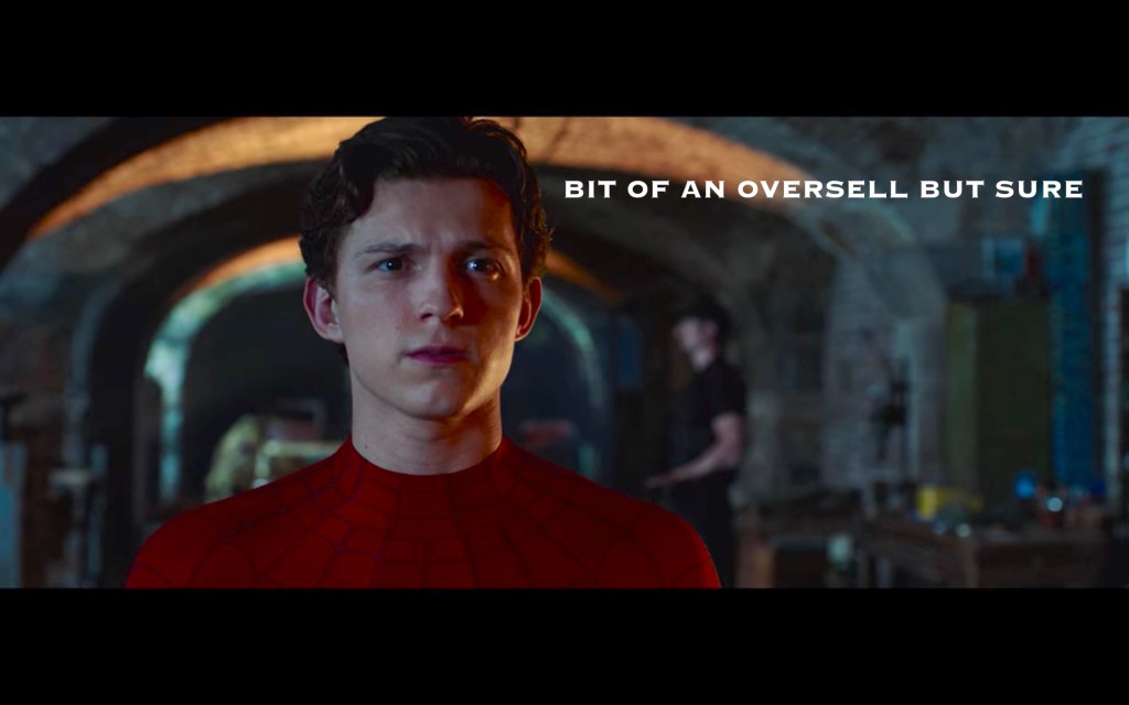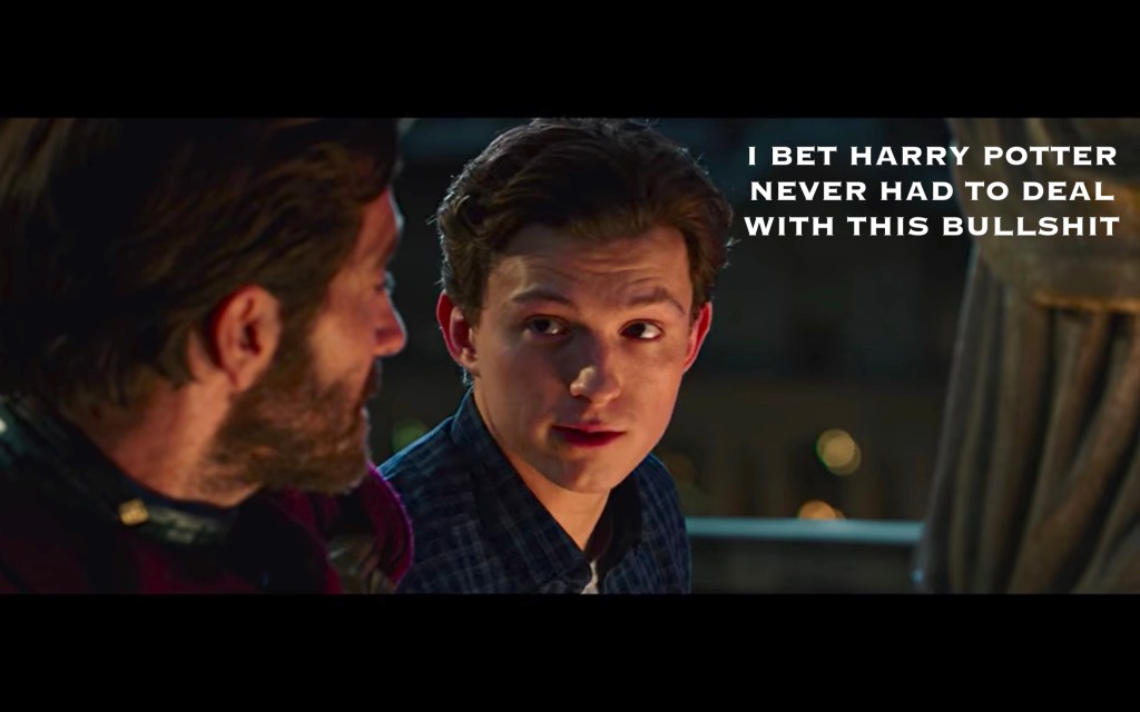 A big theme of this movie was Peter feeling pressure to step up and fill Tony’s shoes, which… honestly, why? I understand that he’s smart, and Tony was mentoring him likely for this very purpose, but he’s also a 16 year old child? I also don’t really understand why there NEEDS to be a next Iron Man. Iron Man was Iron Man. Spider-Man is Spider-Man. Just because they have similar brains doesn’t mean one has to replace the other. BUT, the movie needed some emotional turmoil besides grieving, and this was as good as anything else, so okay!