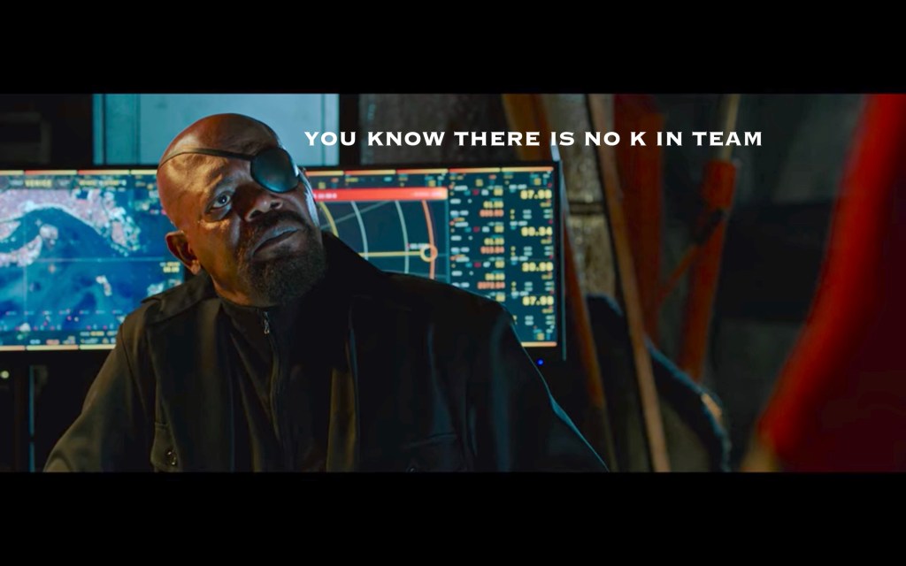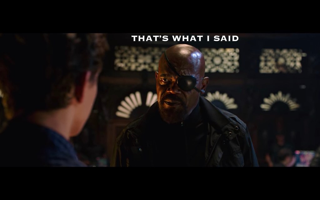 Siiiiiiiiiiiiiiigh. Okay. Fine. So Fury and Hill weren’t Fury or Hill throughout this whole movie. They were being impersonated by Talos and his wife Soren, two shapeshifting Skrulls we met in Captain Marvel. WHY this was happening, we don’t know, other than a shot of For-Real-Fury on a spaceship of some kind having what looked like a vacation.