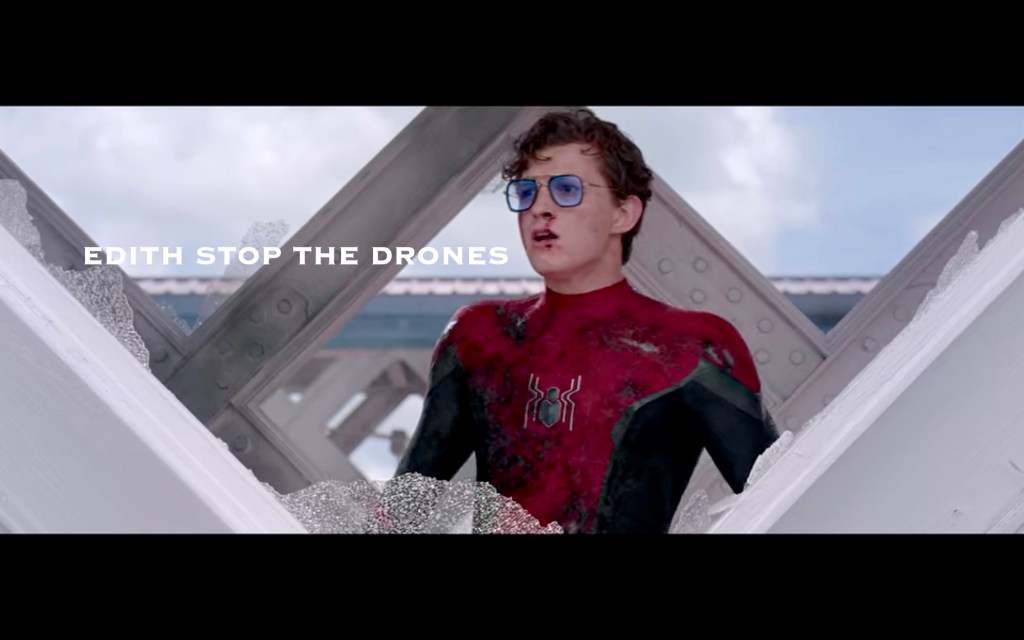 On the bus, Peter tried on the snazzy new glasses Tony bequeathed to him, and it turns out, he basically handed Peter controls to all of his satellites containing drones and spy stuff and weapons and, like, banana peels that people can slip on, that kind of stuff.