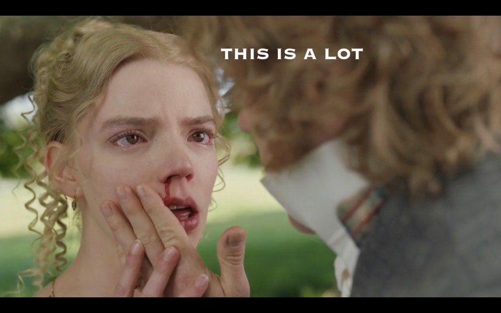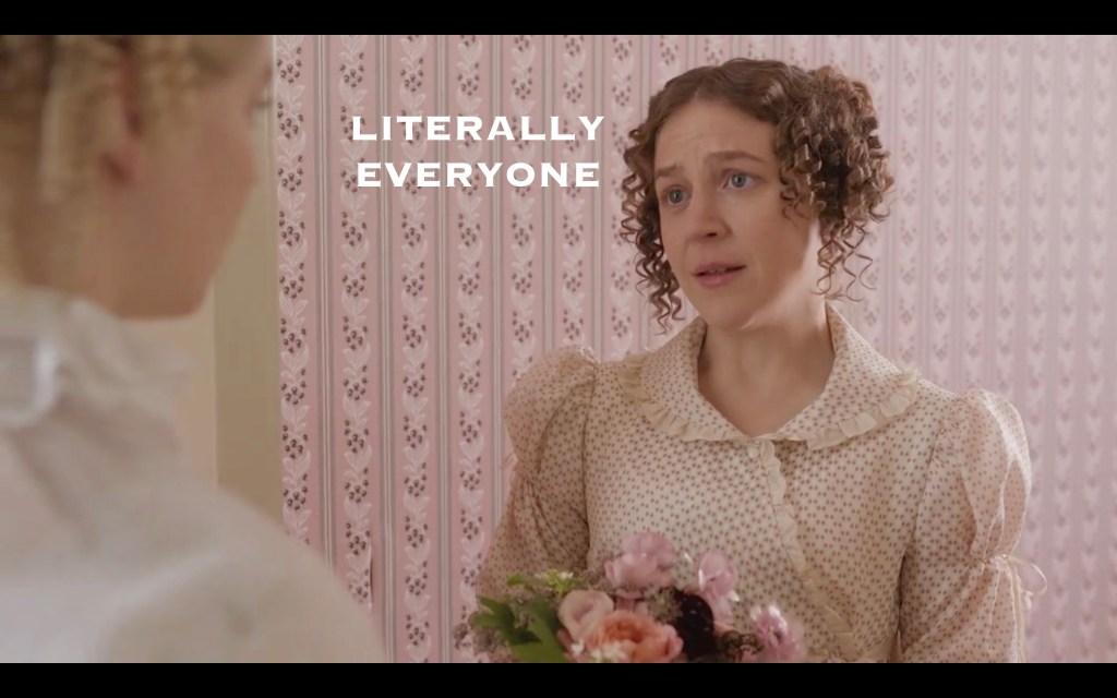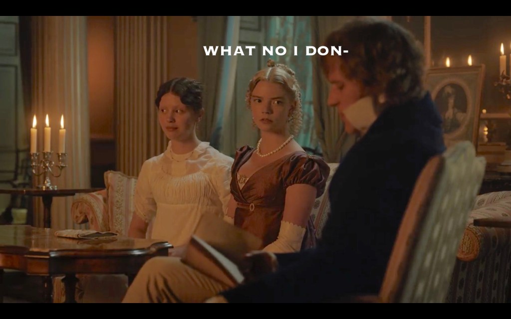 Emma’s sister arrived with her husband, Mr. Knightley’s brother, and their children. Turns out, Mr. Woodhouse’s eldest daughter was just as neurotic as he was, and they all raced out of the room to get a doctor because the baby sneezed. This gave our titular couple some time to flirt-fight some more, when Emma was like, “K but, Farmer Rob isn’t like, upset, right?” and Knightley was all, “uhhhh, YEAH BISH, obviously.”