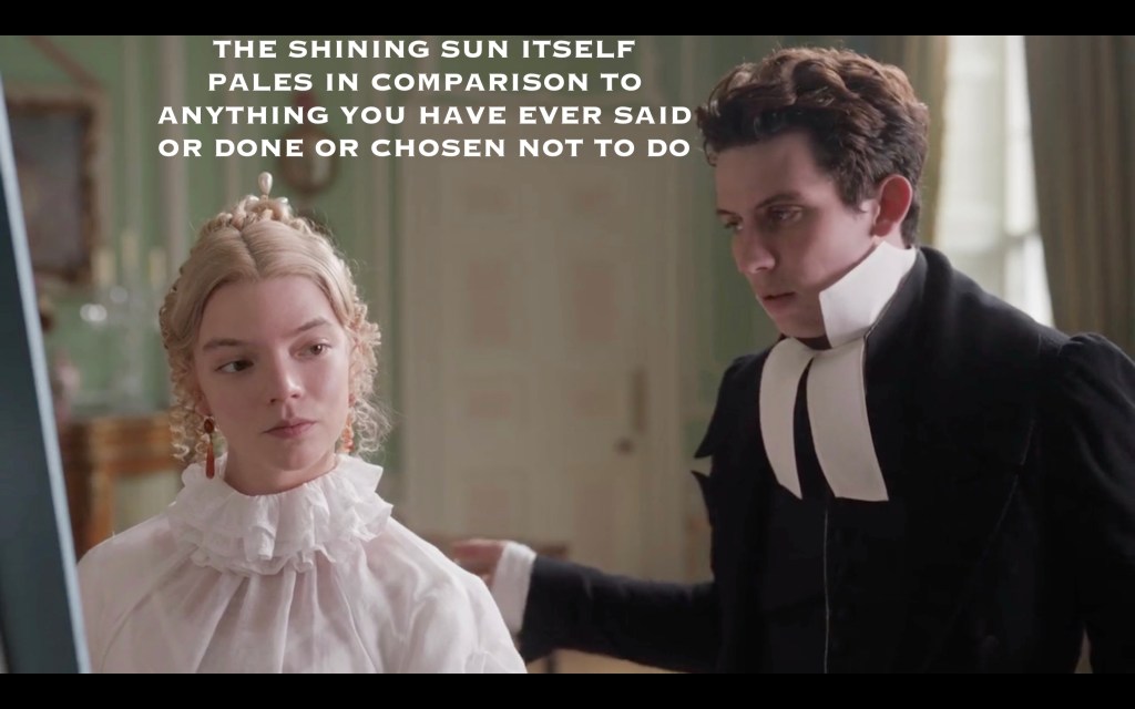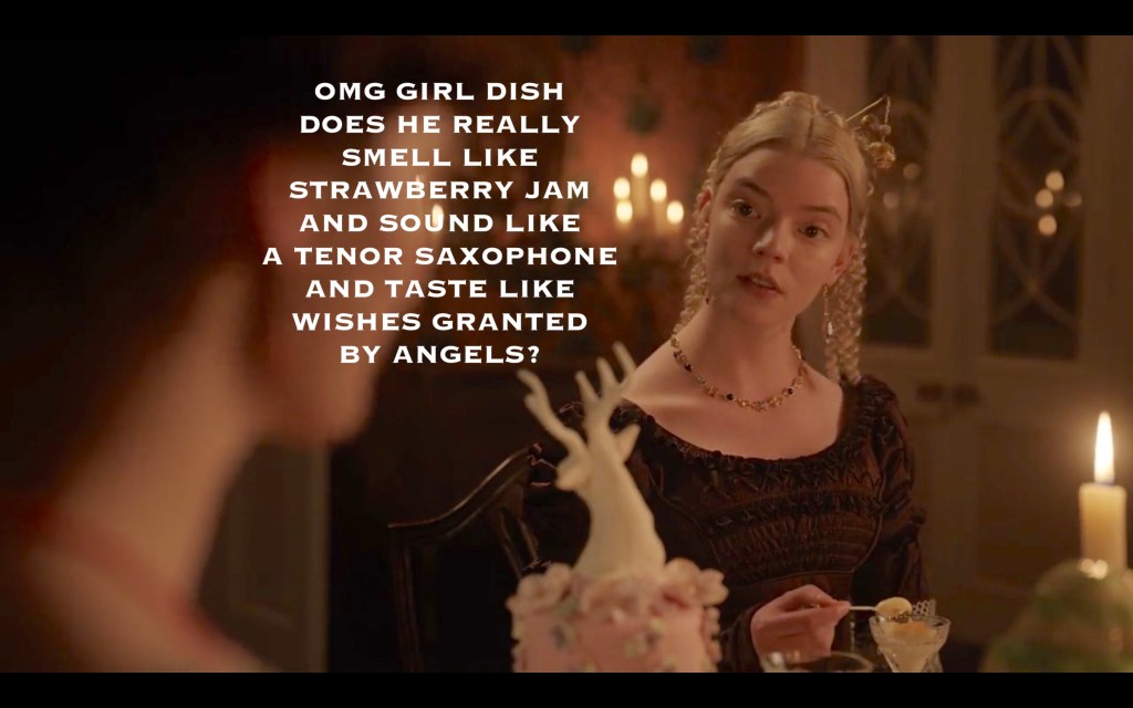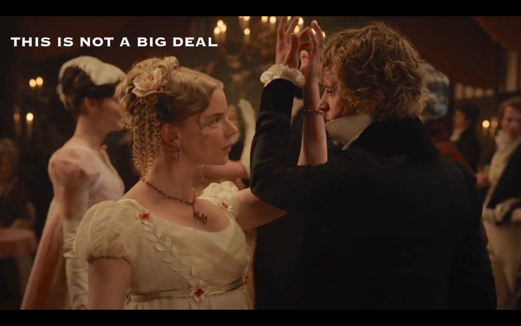That dance scene was so hot, I don’t think I have seen that kind of fire since the P&P hand graze and the run in Persuasion. I liked the wallowing as well, it made the characters very endearing and I agree, it made the movie feel more real in a way. I am very glad there is a fun shorter adaptation of Emma, it was needed. Now, more, pleaase.