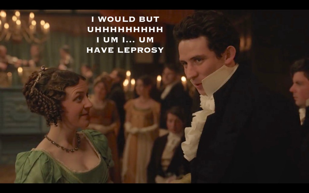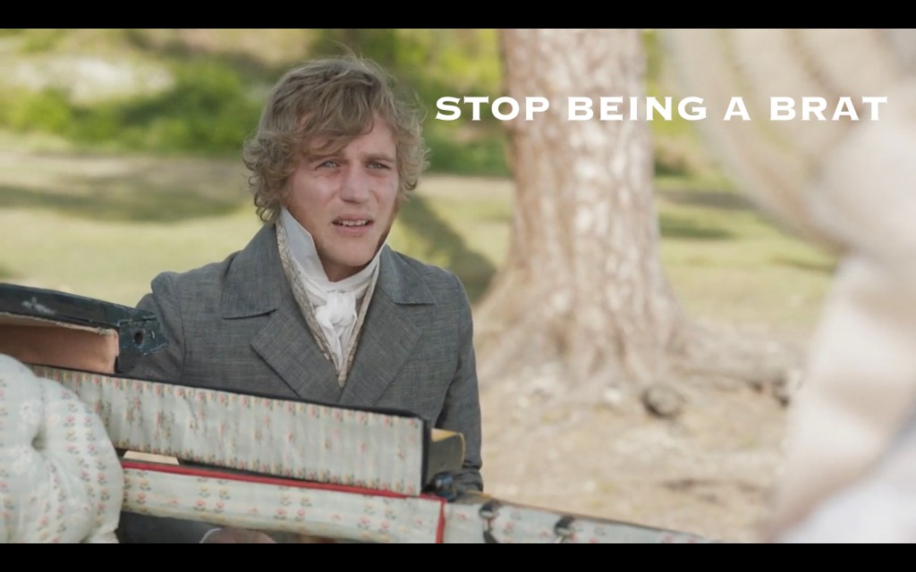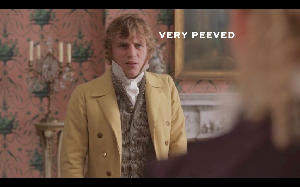 Meanwhile, Mr. Knightley, unable to handle all the big feelings invading his poor lil’ heart, was off on a trip to visit their siblings, to just, like, shake it off, I guess? Because what does a brooding Austen hero do when he can’t handle having emotions? He runs away! Off you go, dear!