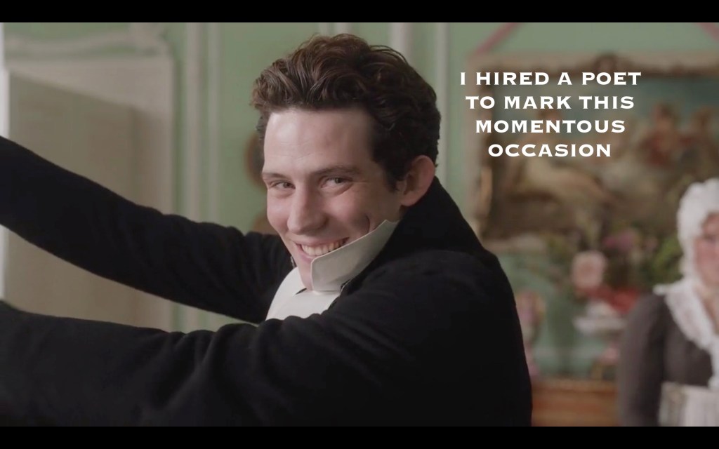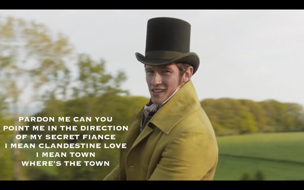 • When Mr. Knightley and Jane Fairfax did their duet, the song they sang happened to be one that I had learned in choir, so I actually gasped and said, “Drink To Me Only With Thine Eyes?? This shit is my JAM!”