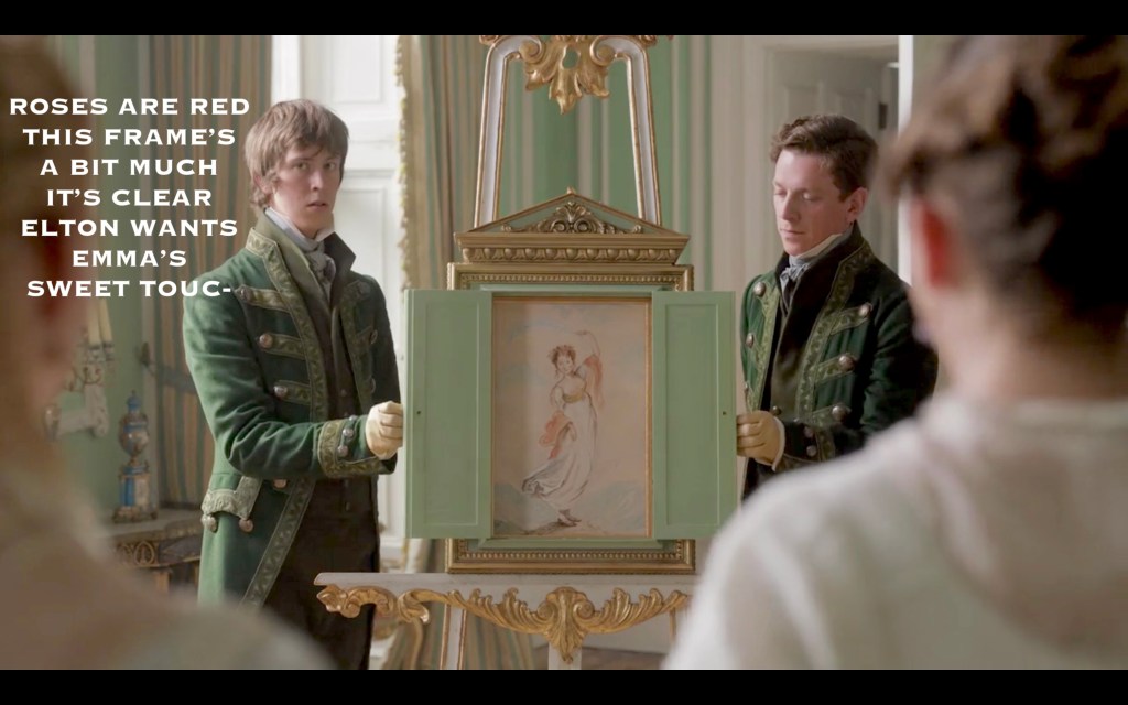 Girl was SO CAGEY about Frank and then to add to Emma’s peeve-itude, she 100% showed her up on the piano. Mr. Knightley was like, “Damn, she can sing and dance and is beautiful and can recite the opening scrawl to every Star Wars movie, she’s the perfect woman,” and Emma was like, “well sure, if you’re into that sort of thing.”