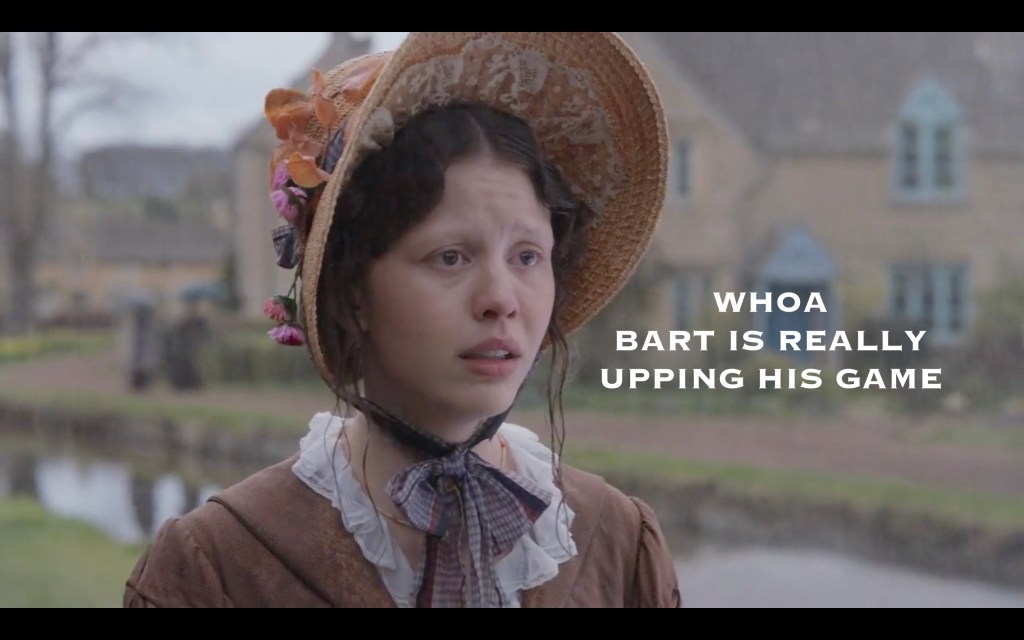 We all have that one annoying friend who can’t read social cues (my apologies for every person who read this and thought OH SHIT IS IT ME??), and we’ve all probably been as rude as Emma was when she tried to dismiss Miss Bates. Luckily Miss Bates was oblivious enough not to notice. But the rudeness didn’t stop there! On the way home, our girl and her New Toy ran into Farmer Rob, the working-class toy accessory that Emma wanted to do without. She just walked by, pretending to notice a particularly bad smell in the air, and then shit-talked him for good measure.