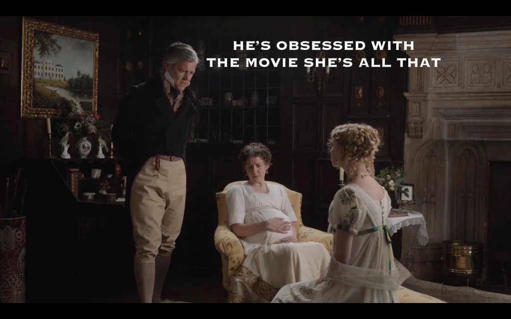 Mr. Knightley scold-chased Emma around the house yelling at her for convincing Harriet out of a pretty darn good match, and Emma shot back that being beautiful is a woman’s only worthy commodity, and nothing else matters, because men are the worst.