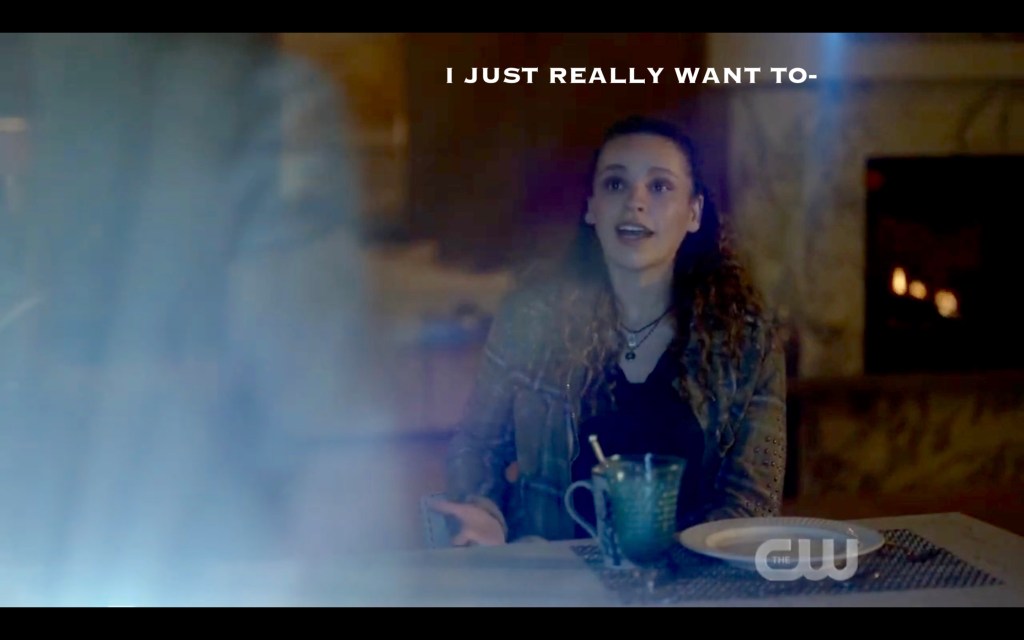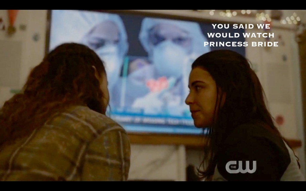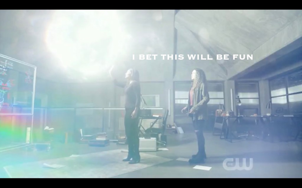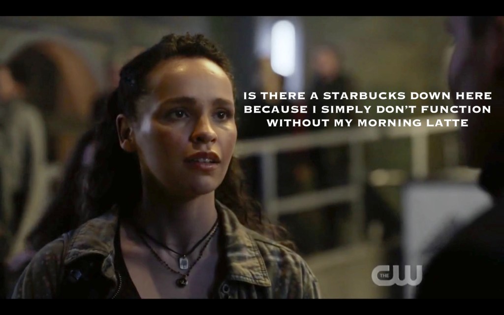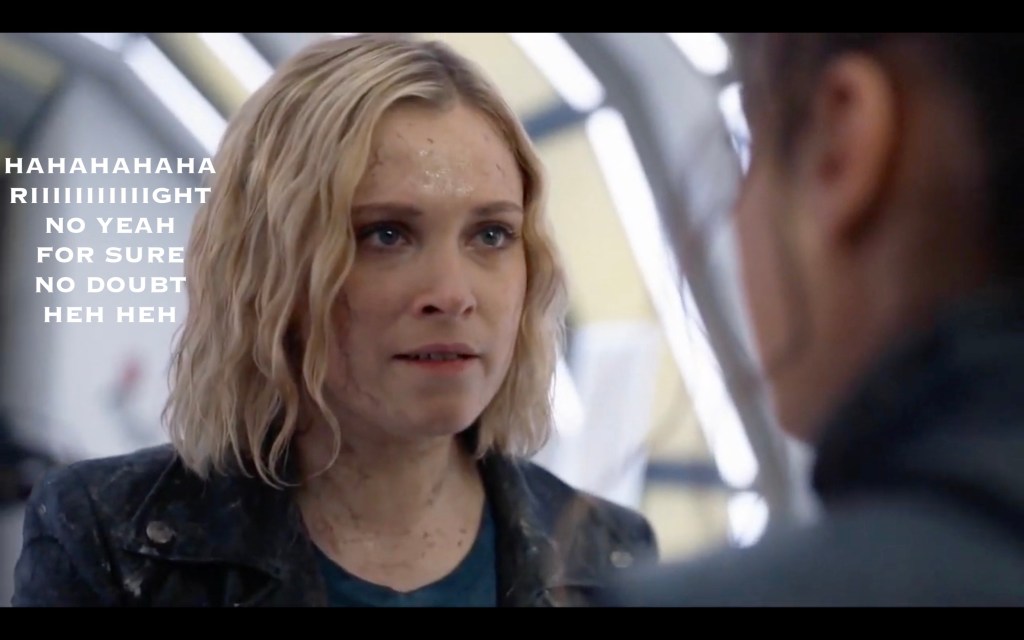 She and her bestie-for-ever-and-ever (read: for approximately seven more minutes) talked about being super cool activists, fighting THE MAN, and advocating for environmental justice (😍). So many things were mentioned during this conversation: Becca, Cadogann, Trikru(!), her “training”, and the fact that these two ladies are ride-or-die for each other (😢). Then their teen rebellion was interrupted by a call on the future-phone by a certain nosy antagonist.