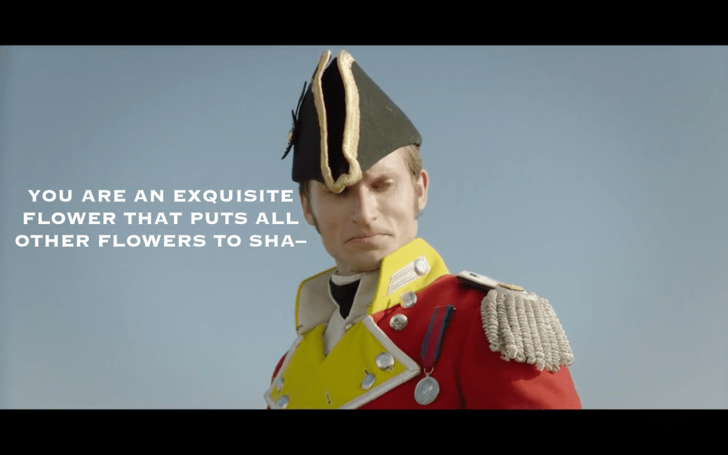 On Charlotte’s way to her first day at work (like, ever), Colonel Second-Lead pep talked her from on top of a horse while wearing a very pointy hat. Honestly, I have nothing against this man, he seems very supportive and nice! He’s just not a brooding, complex dad-uncle with a heartbreaking backstory and adorable cheeks. **shrugs** I don’t make the rules.