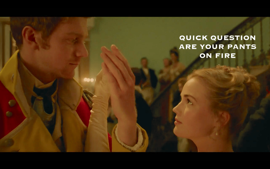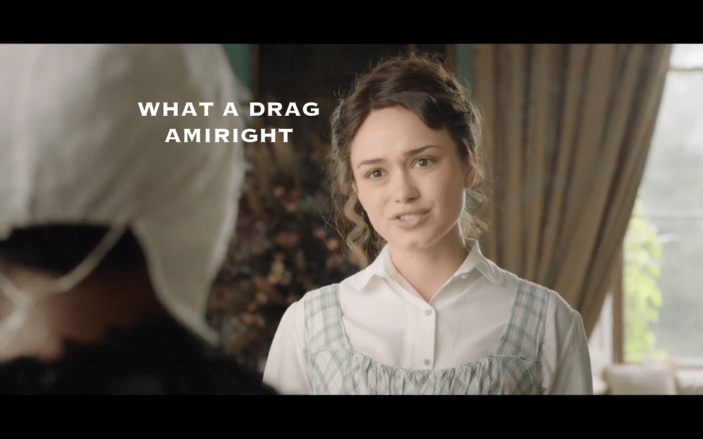 *siiiiiiiiiiiiiigh* Is this really the way this is going? Is this really Georgiana’s romance? From the moment he met her, he’s been negging her, telling her that her life isn’t good enough, that her choices aren’t bold enough, that she needs to change to be the kind of person HE thinks she should be. Now he says he loves her. And that he’s leaving TOMORROW and he wants her to go with him. Tomorrow???? Don’t give her a chance to think about it or anything!