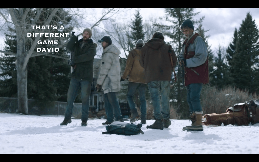 James shot the horse (RIP noble steed) and Ellie flew off (which tbh looked very fun in different circumstances, like if it was into a big ol fluffy snow bank, sign me up!). David stopped James from killing his crush and stormed off in a huff, leaving the rest of them to hunt down a dreamy crazy man.