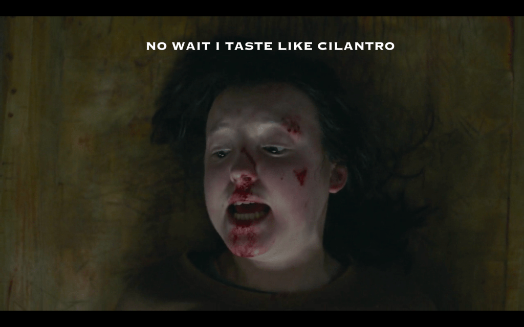 The daughter of Joel’s mad killing spree victim was pretty bloodthirsty, and even though he too was bloodthirsty, David gave her a slap for not letting him say it first. Then he was all, “I’m your daddy now, girl.” And she was like, “ugh gross,” and he was like, “ugh gross WHAT,” and she rolled her eyes, “uhg, gross… Daddy,” and then they dug into their human flesh casserole.
