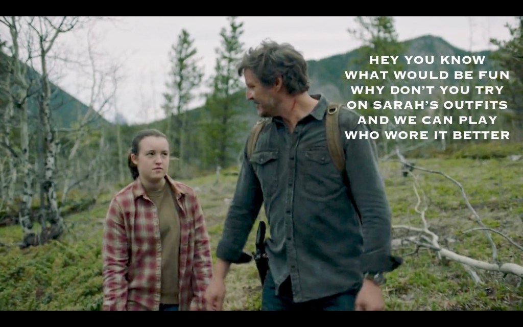 Joel was dadding SO HARD: offering to teach her guitar, finding games they can play, suggesting they record a TikTok dance, ANYTHING to make her engage with him. She was also trying so hard to be normal and respond to him, but she was just so busy PTSD-ing that it was hard to concentrate on anything else.