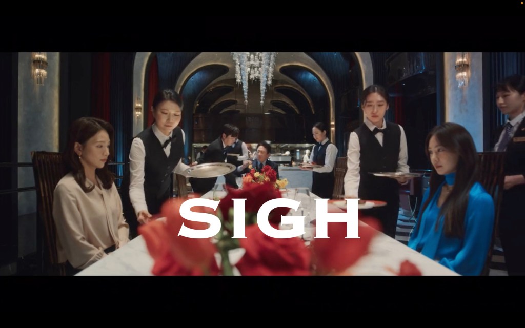 Out of everyone on this show, Chaebol Dad is the stinkiest. He has relegated his daughters to baby making machines without agency, assigning them tasks like “make me a grandchild” and “marry whoever I want you to,” in order to get ‘rewards’. So, when he learned during this dinner that the eggs had been destroyed and he had some sort of fit, I was rooting for his death. But he survived (**eye roll**) and now he wants Ryong to take over and risk everything and everyone. Because of course.