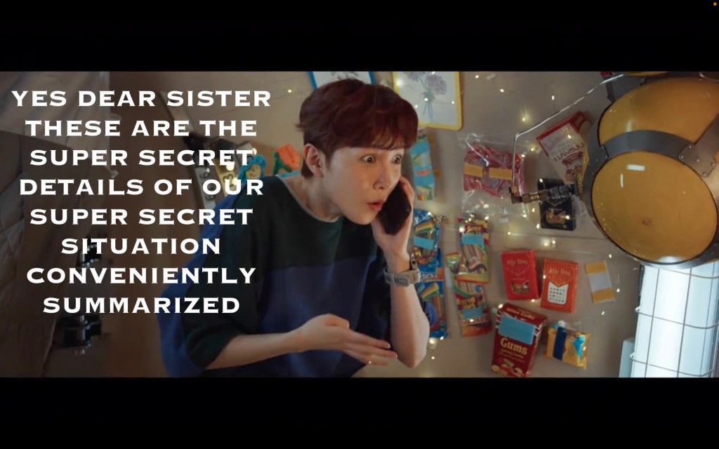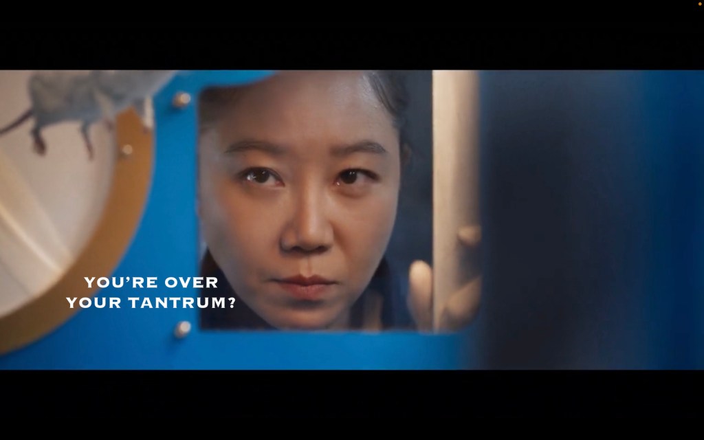 Rule #1 of having a secret is maybe don’t scream about it on a space station where the walls of your ‘room’ are a blanket? Space Twin was giving her sister a “previously on” episode recap and Mouse Doctor overheard. And here’s what I’m liking about this show: the shot afterwards of a glowing rush of money was such a cool visual representation of what he was feeling in that moment.